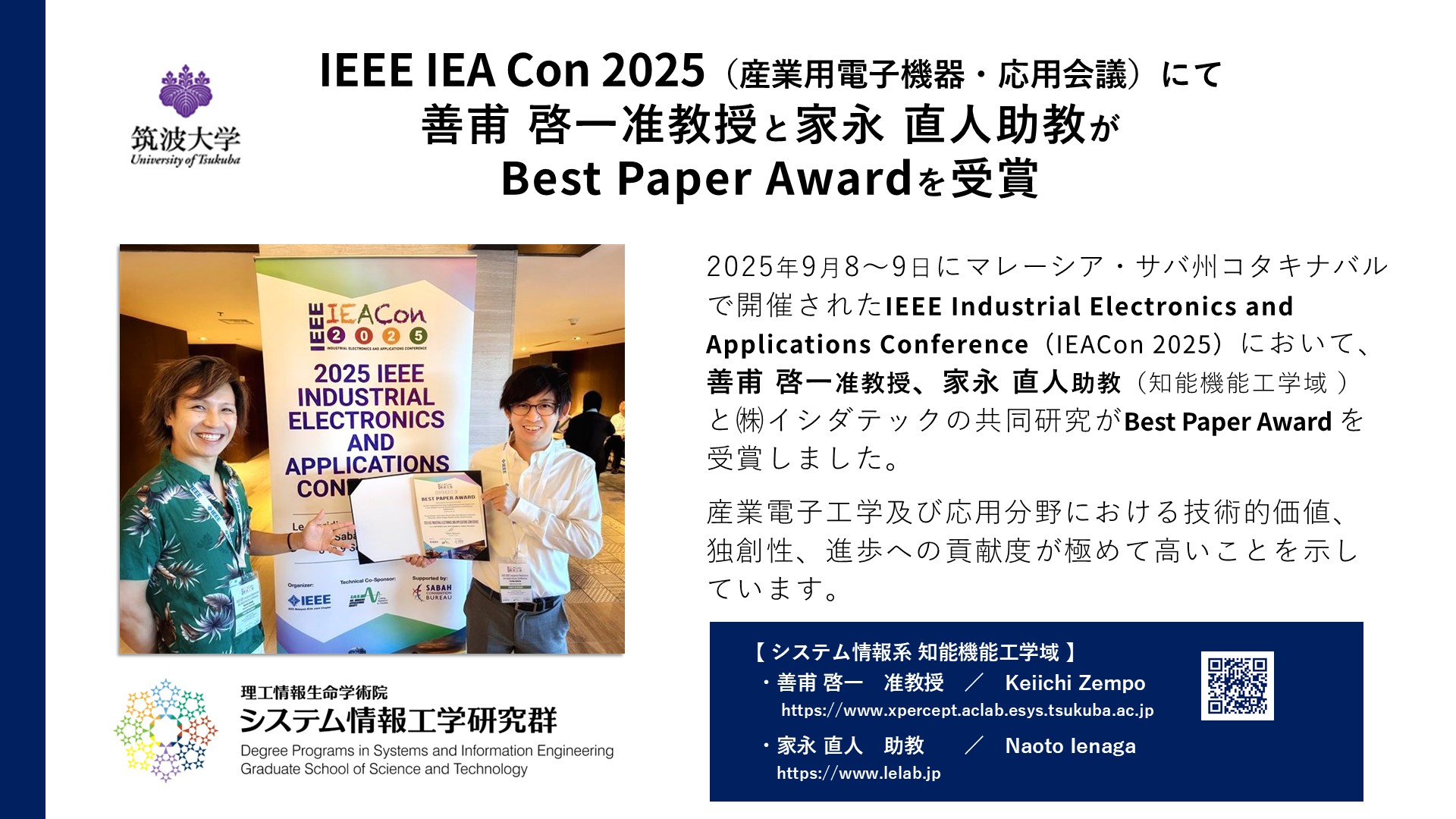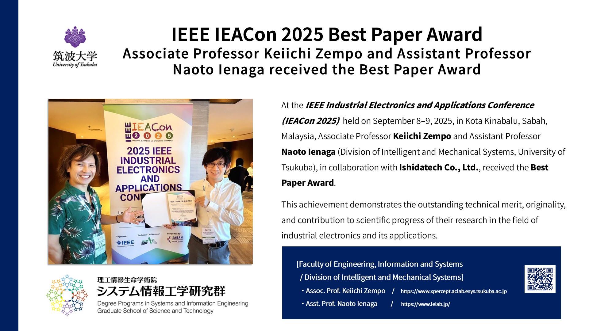 At the IEEE Industrial Electronics and Applications Conference (lEACon 2025) held on September 8-9, 2025, in Kota Kinabalu, Sabah, Malaysia, Associate Professor Keiichi Zempo and Assistant Professor Naoto lenaga (Division of Intelligent and Mechanical Systems, University of Tsukuba), in collaboration with Ishidatech Co., Ltd., received the Best Paper Award.