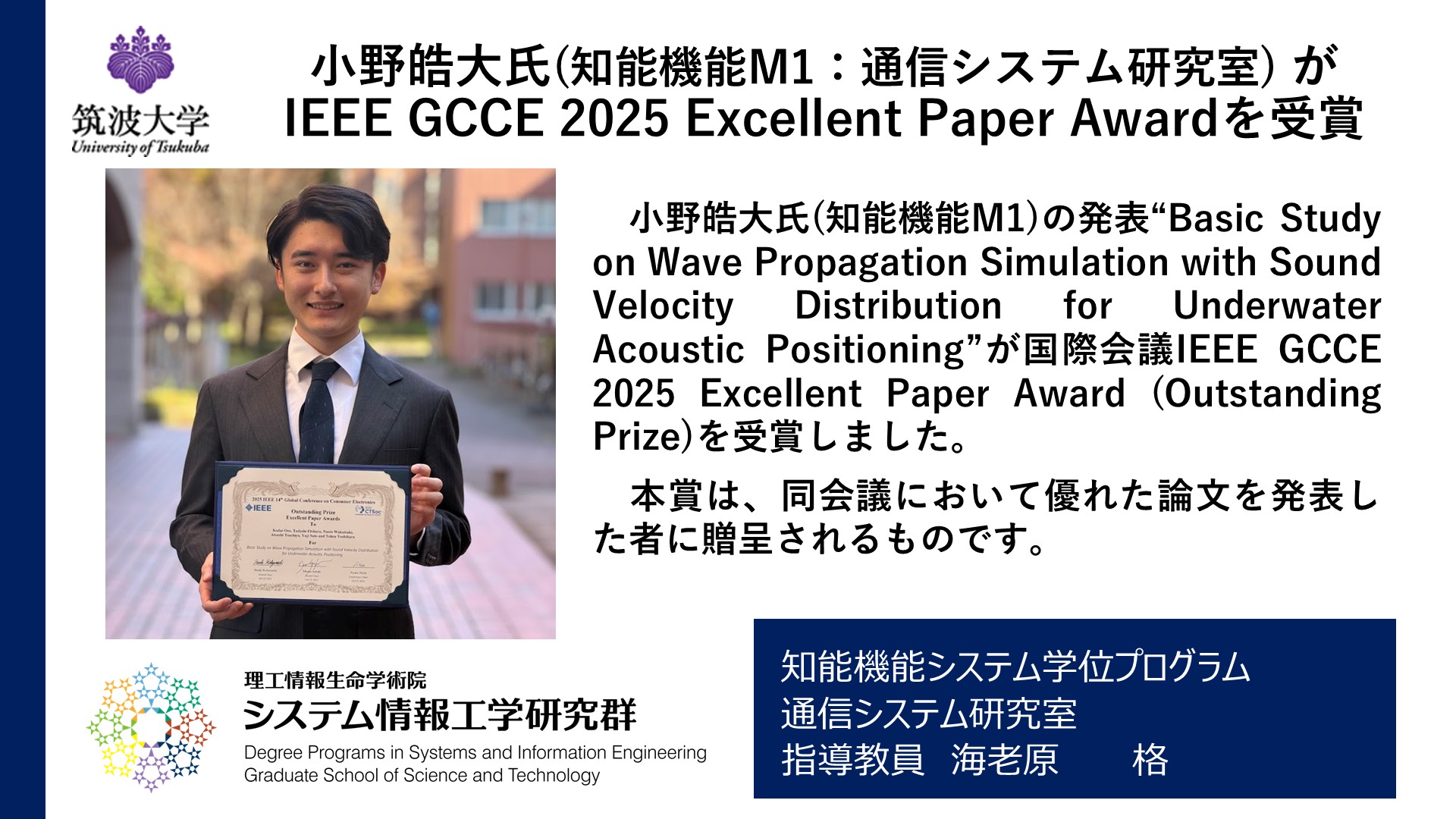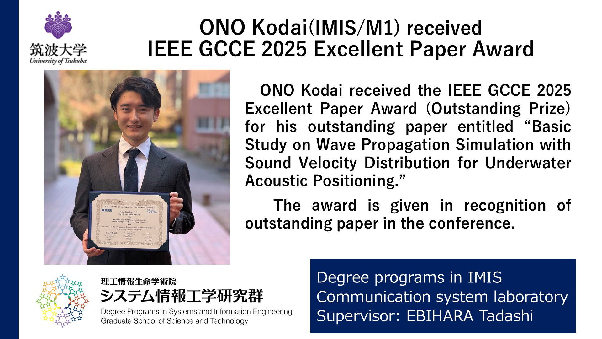 ONO Kodai received the IEEE GCCE 2025 Excellent Paper Award (Outstanding Prize) for his outstanding paper entitled “Basic Study on Wave Propagation Simulation with Sound Velocity Distribution for Underwater Acoustic Positioning.”