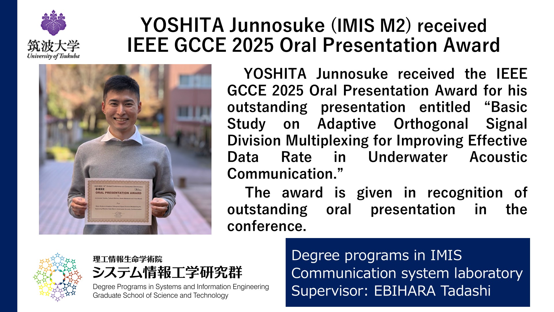 YOSHITA Junnosuke received the IEEE GCCE 2025 Oral Presentation Award for his outstanding presentation entitled “Basic Study on Adaptive Orthogonal Signal Division Multiplexing for Improving Effective Data Rate in Underwater Acoustic Communication.”
