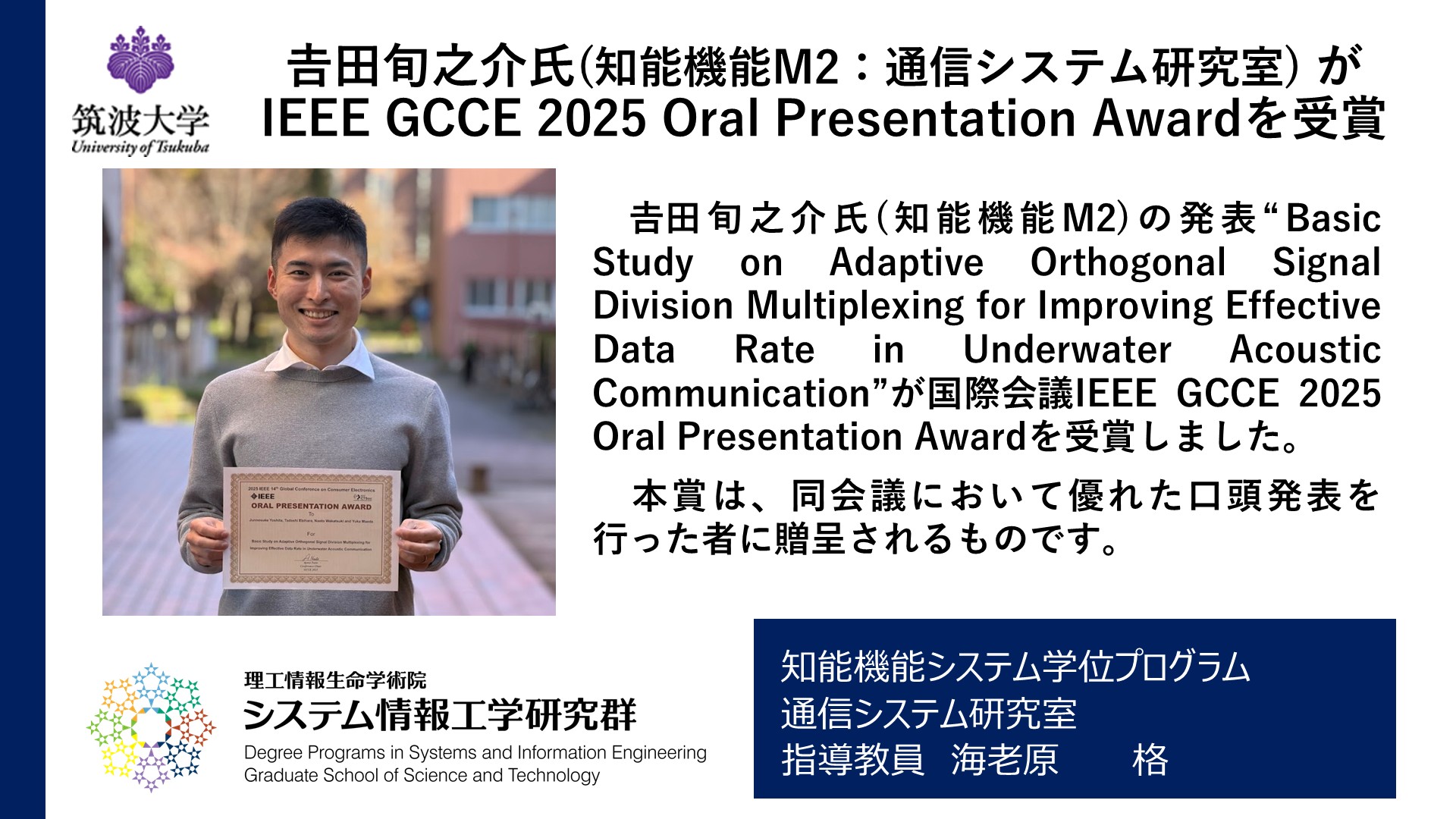 𠮷田旬之介氏(知能機能M2)の発表“Basic Study on Adaptive Orthogonal Signal Division Multiplexing for Improving Effective Data Rate in Underwater Acoustic Communication”が国際会議IEEE GCCE 2025 Oral Presentation Awardを受賞しました。